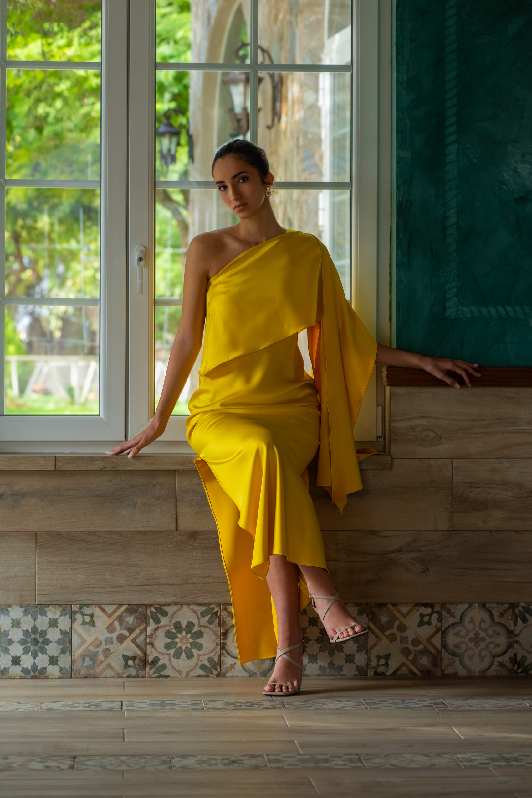 El Vestido Isabel Amarillo es ideal para invitadas que buscan un look lleno de personalidad y luminosidad. Su escote asimétrico y el pañuelo versátil permiten adaptar el estilo a cada ocasión, convirtiéndolo en una prenda tan sofisticada como versátil.