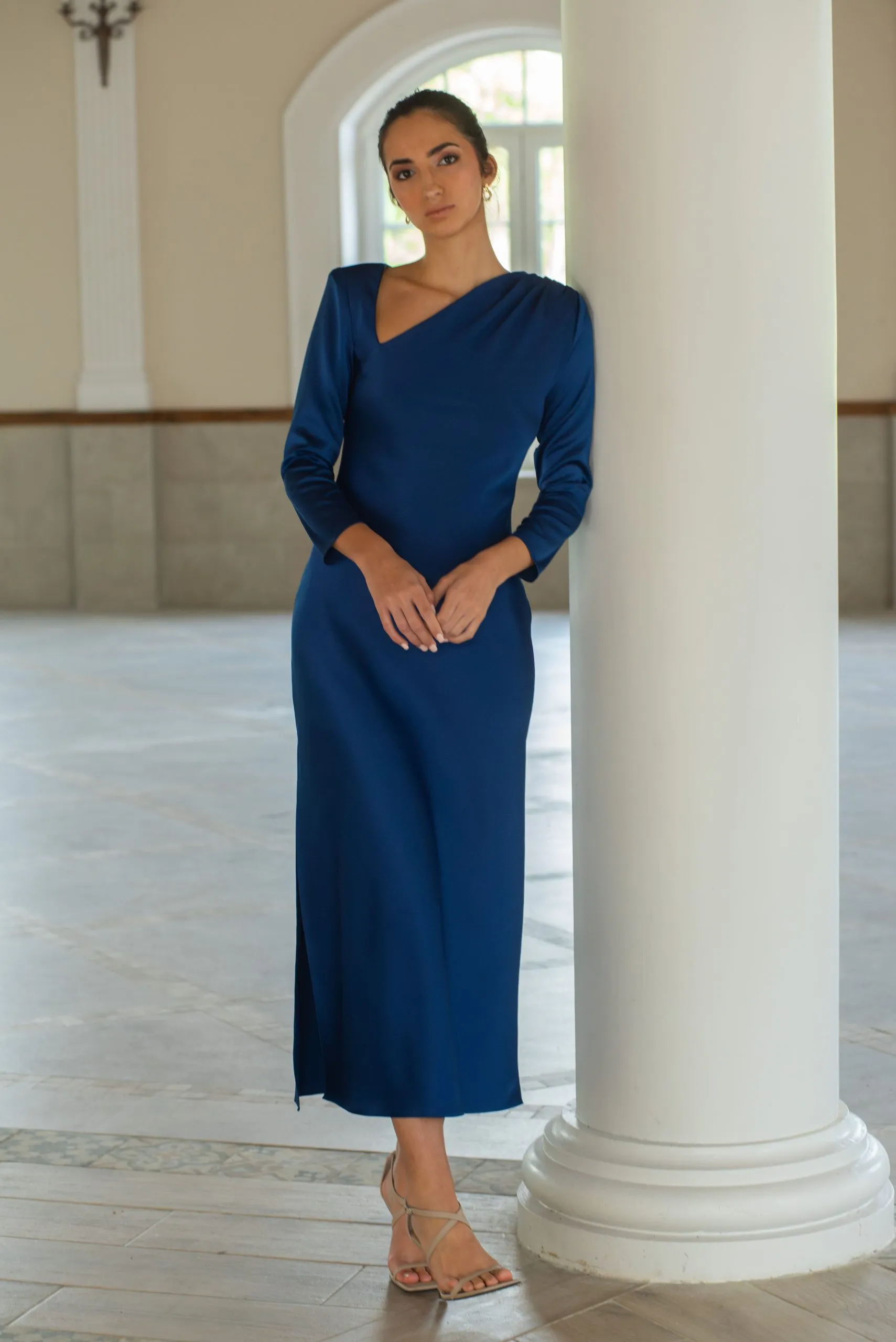 El Vestido María Azul Noche es una prenda atemporal que combina sofisticación y versatilidad. Su escote asimétrico, la manga francesa y el largo midi lo convierten en un diseño perfecto para ocasiones en las que quieres destacar con discreción y estilo.