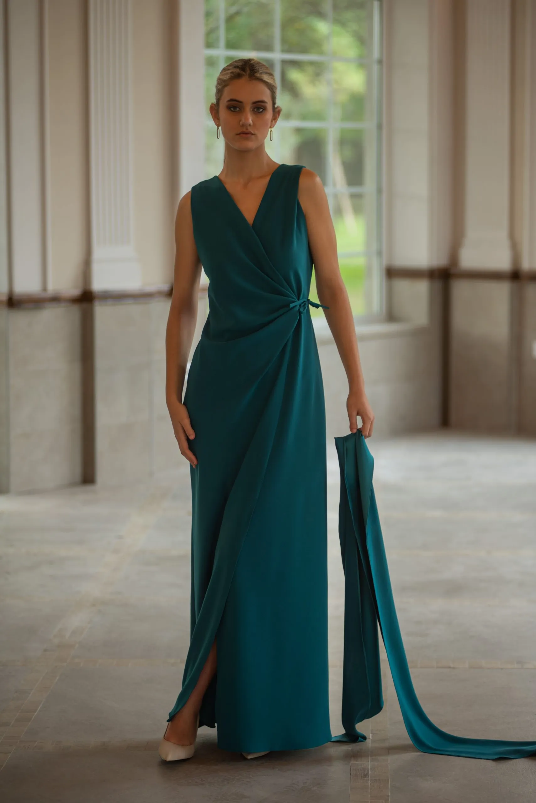 El Vestido Martina en color verde pato destaca por su tono profundo y elegante, su escote en V y el delantero cruzado que estiliza la silueta. La abertura delantera y el pañuelo satinado lo convierten en un diseño versátil y sofisticado.